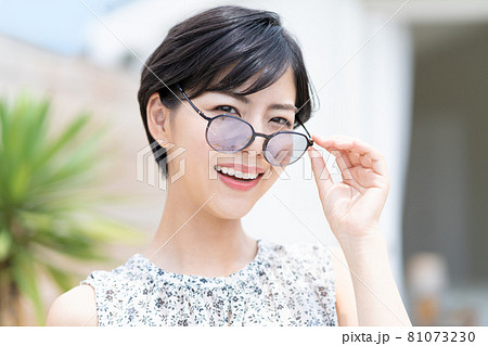 サングラスをかける若い女性のバストアップのポートレート