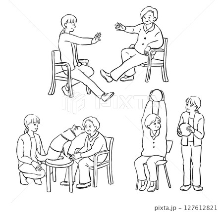 福祉・介護:シニア女性の運動やドッグセラピーを見守る若い女性