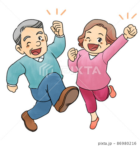 ガッツポーズでジャンプするシニア男女のイラスト