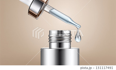 透明な美容液がスポイトから落ちる瞬間を捉えた、セラム系シルバーボトルのスキンケア製品のビジュアル素材