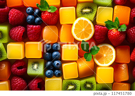 Fruit puzzle. Food background ,pattern. Variety of fruit cubes. Flat lay, top view. Generative Ai