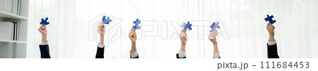 Panorama banner of business team assembling jigsaw puzzle. Shrewd