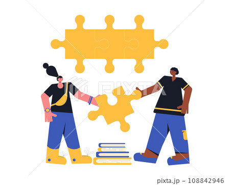 Person places jigsaw puzzle piece onto stack of connected pieces signifying teamwork and problem-solving. Ideal for collaboration, strategy, project management, growth, planning. Simple minimal