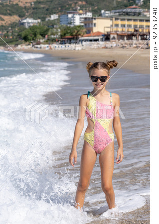 A happy little girl runs along Cleopatra Beach in Alanya, Turkey.