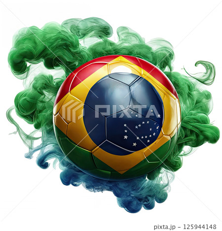 Illustration Soccer ball Brazil Smoke Flag country green, yellow, blue, brush paint watercolor drawn stroke texture isolated background