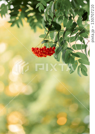 Beautiful autumn background with bunches of red rowan berries on blurred nature. Vertical photo . High quality photo
