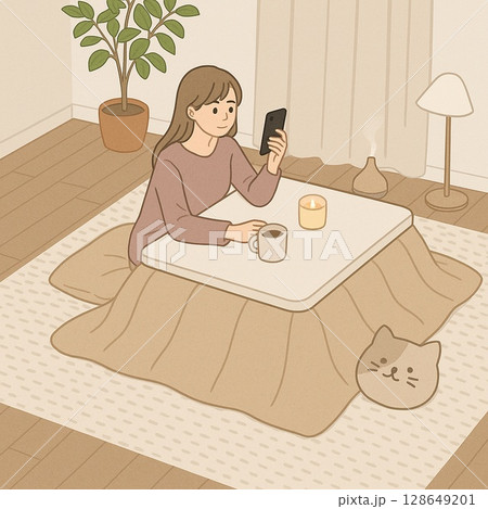 こたつでくつろぐ若い女性のイラスト 一人暮らし Generative AI