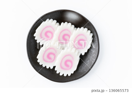 白背景にお皿に並べたスライスしたなると巻き