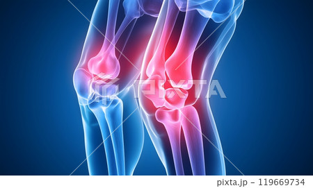 X ray view of a human leg with the knee joint highlighted showing inflammation and pain. This medical illustration could be used to represent a number of orthopedic conditions