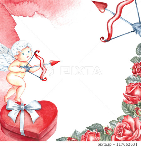 A frame with red roses, a cupid with a bow and arrow and a heart-shaped gift box. Hand-made watercolor illustration. A greeting card for lovers, for Valentine's Day and wedding, suitable for packaging