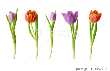 Collection of tulip flowers isolated on white background. Set of variety springtime tulip flower for holiday decoration design.