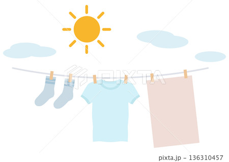 太陽の下でTシャツ・タオル・靴下を干す洗濯イラスト|清潔・家事・乾燥