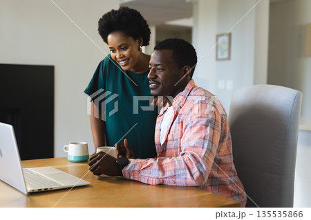 Diverse young man smiling, reaching to hold hand in dining room with birthday cake and balloons