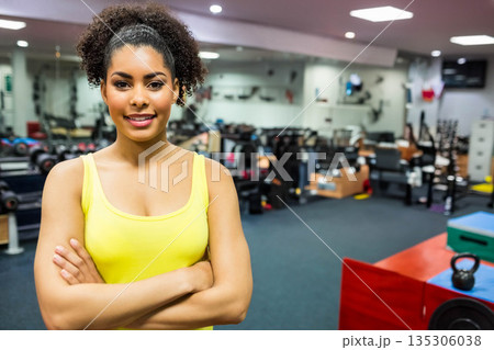 Woman crossing arms and smiling while standing in gym with dumbbells, yellow tank top, copy space