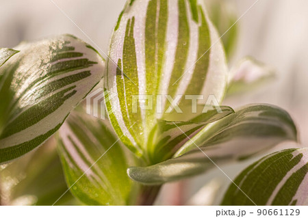 Macro photo of a Tradescantia variegated leaf. Blurred foreground and