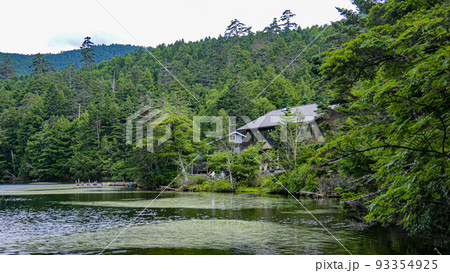 初秋の北八ヶ岳 白駒池がある風景 ボートと白駒荘遠景