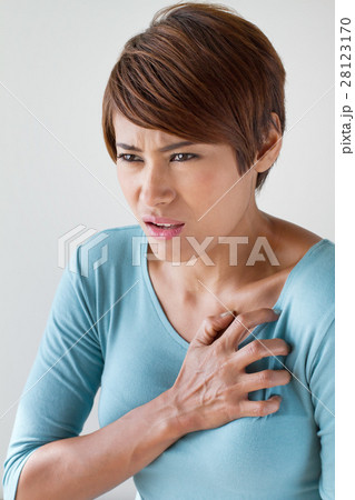 sick woman with heart attack, pain, health problem holding touching her chest with hands isolated on