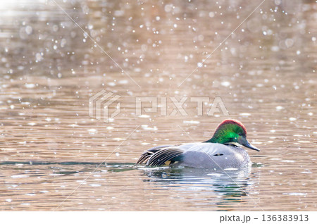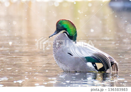 振ってくる雪を見るヨシガモの雄