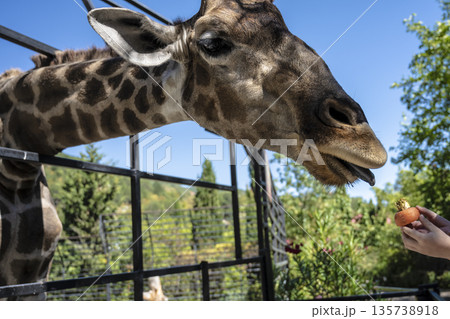 Giraffe seeks treat, Longtongued giraffe accepts snack from visitor, Giraffe stretches tongue to receive food from guest