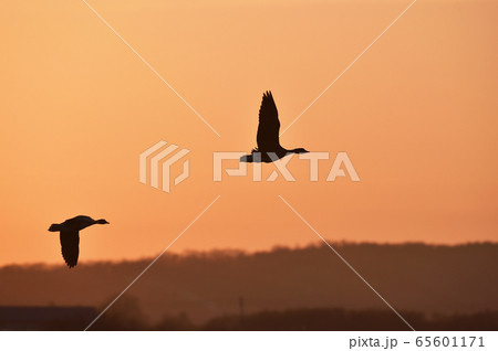 夕焼け空とマガンの群れ