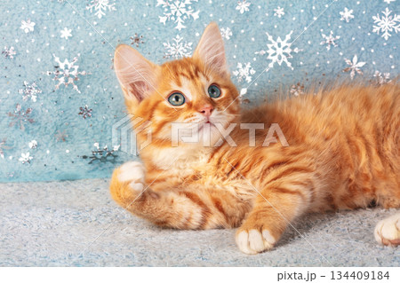A cute little playful ginger kitten lies on its back on a blue background with snowflakes and raises its paw up