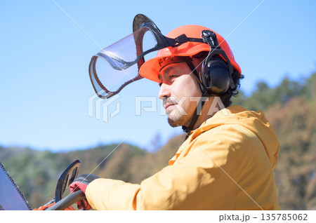 チェンソーを持つ林業、第一次産業のイメージカメラ目線の笑顔