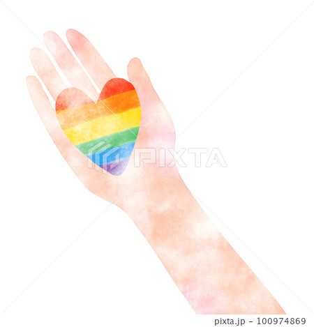 水彩風虹色のハートを持つ手