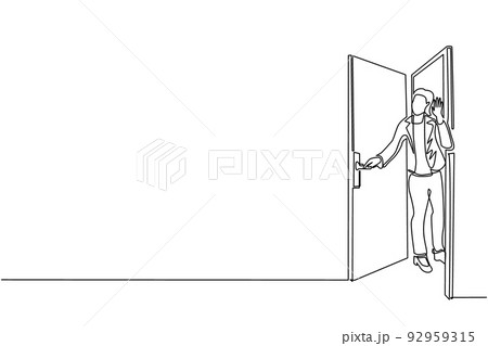 Single one line drawing businesswoman looking from behind open door. Woman peeking of door and wave hands. Cheerful female standing in doorway. Continuous line draw design graphic vector illustration
