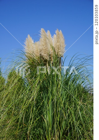 大きなふわふわの穂がつくパンパスグラスの蕾と青空