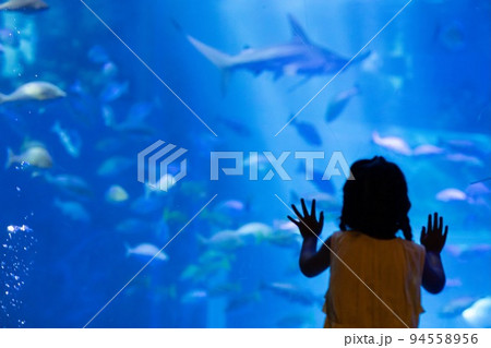大水槽前でジンベエザメに見入る少女たち