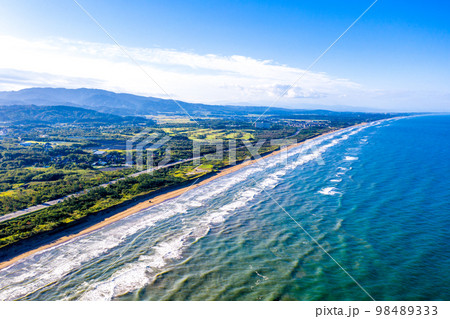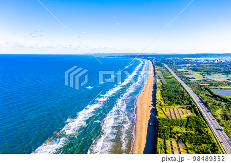 ドローン|日本で唯一自動車で走れる海岸の千里浜なぎさドライブウェイ|海上から南方面|石川県羽咋市