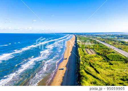 ドローン|日本で唯一自動車で走れる海岸の千里浜なぎさドライブウェイ|海上から北方面|石川県羽咋市