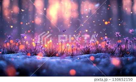 Vibrant purple and orange flowers bloom in lush, dreamy twilight jungle, creating enchanting and magical atmosphere