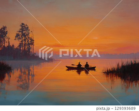 Peaceful sunset scene with two people kayaking on calm water, surrounded by trees and reeds, reflecting vibrant orange and pink hues, creating tranquil and scenic outdoor setting