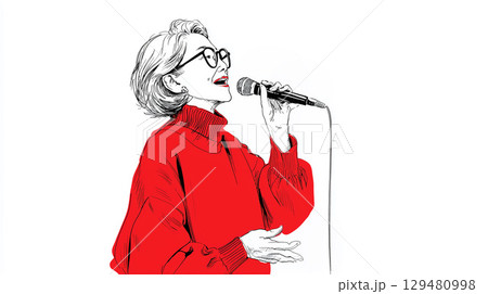 赤い服を着た眼鏡の年配女性が情熱的に歌う