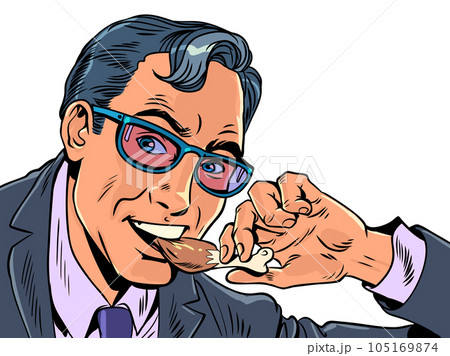 Snack or lunch for office workers in their business centers. Convenient and delicious snacks anywhere in the city. A man in a suit and glasses eats a chicken leg. Pop Art Retro