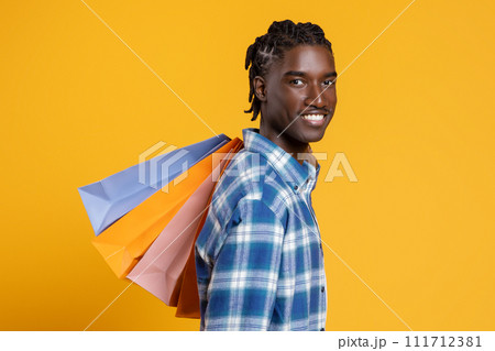 Portrait Of Happy Cheerful Black Man Holding Lots Of Bright Shopping Bags