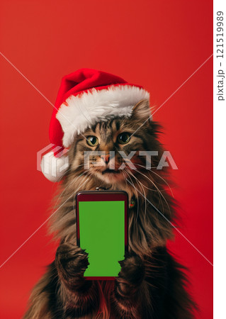 Festive christmas cat in santa hat holding smartphone with chroma key screen