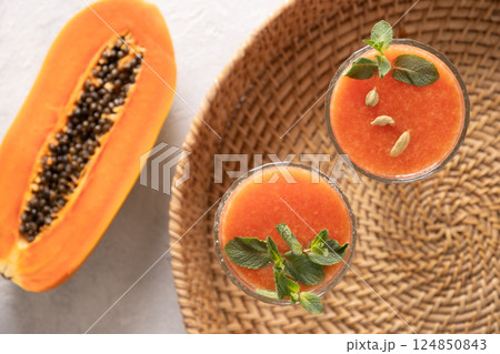 Asian popular Papaya lassi, smoothie made of water and ice. Traditional beverage in India and Sri Lanka. View from above. Close up.