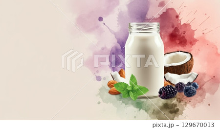 Vegan milk jar with almonds, coconut, berries, and mint on colorful watercolor background