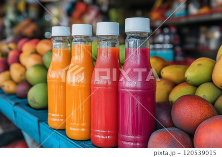 Four bottles of vibrant juice in orange, red, and purple displayed with mangoes at an outdoor market