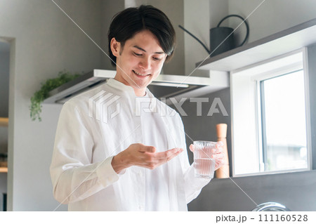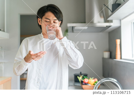 キッチンで内服薬・サプリ・医薬品を飲む病気の男性・投薬