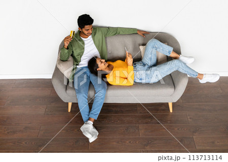 Relaxed hindu couple with credit card and phone on sofa
