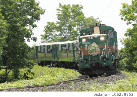 夏の北海道の釧路湿原のカーブをを走行中のくしろ湿原ノロッコ号