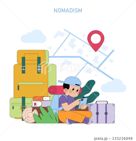 Vector illustration of a young traveler surrounded by luggage while using a digital map. The scene emphasizes the concept of nomadism and digital exploration in travel.