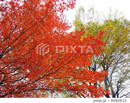 秋の公園のオレンジ色のハウチワカエデ