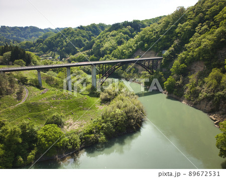 姫川第二ダムの放水と赤白二つの鉄橋 長野県白馬村(ドローンによる空撮)