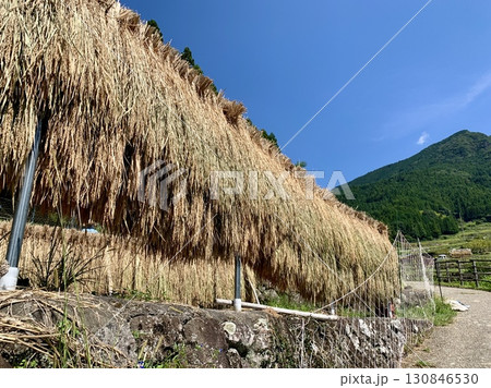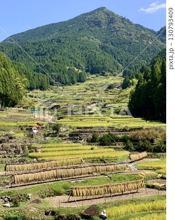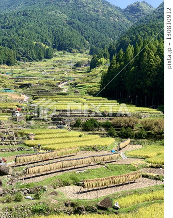 収穫作業(稲刈り・はざ干し)が始まった棚田[四谷千枚田/愛知県新城市]