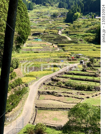 秋の収穫(稲刈り)が始まった棚田を見下ろす〈四谷千枚田/愛知県新城市〉