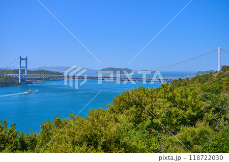 岡山県倉敷市の鷲羽山から西側の眺望(下津井瀬戸大橋,櫃石島橋,岩黒島橋など)